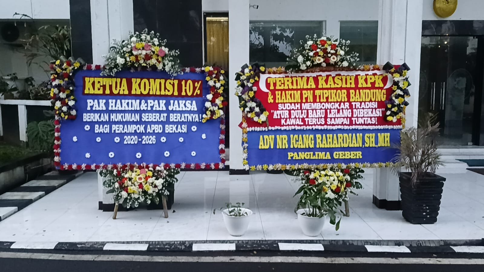 ”Terima kasih KPK & Hakim PN Tipikor Bandung sudah membongkar tradisi ‘Atur Dulu Baru Lelang di Bekasi’. Kawal terus sampai tuntas!” demikian bunyi pesan yang tertulis pada karangan bunga tersebut. Rabu 8/4/2026