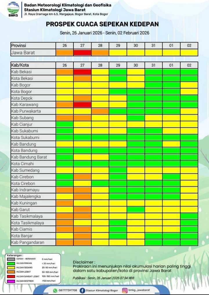 Prakiraan cuaca tersebut dipublikasikan oleh BMKG Stasiun Klimatologi Jawa Barat pada Senin, 26 Januari 2026, pukul 07.34 WIB.