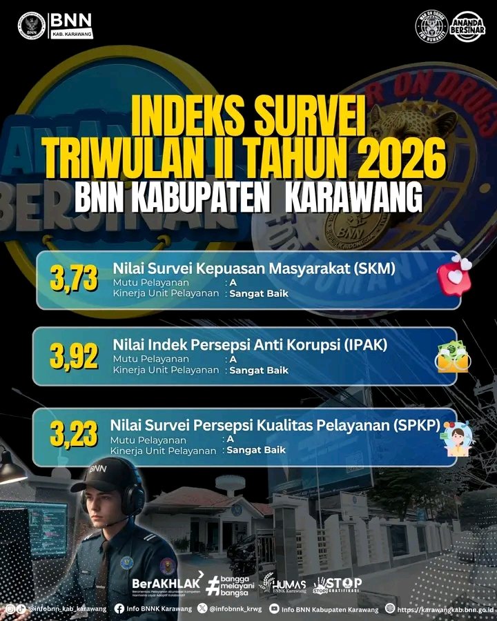 KARAWANG | SUARAPURWASUKA.COM– Badan Narkotika Nasional (BNN) Kabupaten Karawang merilis hasil indeks survei Triwulan II Tahun 2026 yang menunjukkan capaian positif dalam kinerja pelayanan publik. Berdasarkan data yang dipublikasikan, seluruh indikator utama memperoleh predikat “Sangat Baik”.