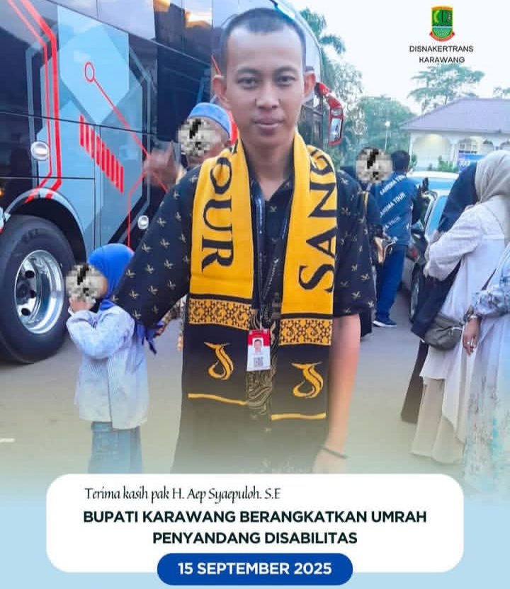 KARAWANG | SUARAPURWASUKA.COM– Kebahagiaan dan kebanggaan dirasakan keluarga besar Dinas Tenaga Kerja dan Transmigrasi (Disnakertrans) Kabupaten Karawang. Salah satu tenaga harian lepas (THL) yang juga penyandang disabilitas, Muhammad Rodi Kurnia, diberangkatkan untuk menunaikan ibadah umrah ke Tanah Suci.
