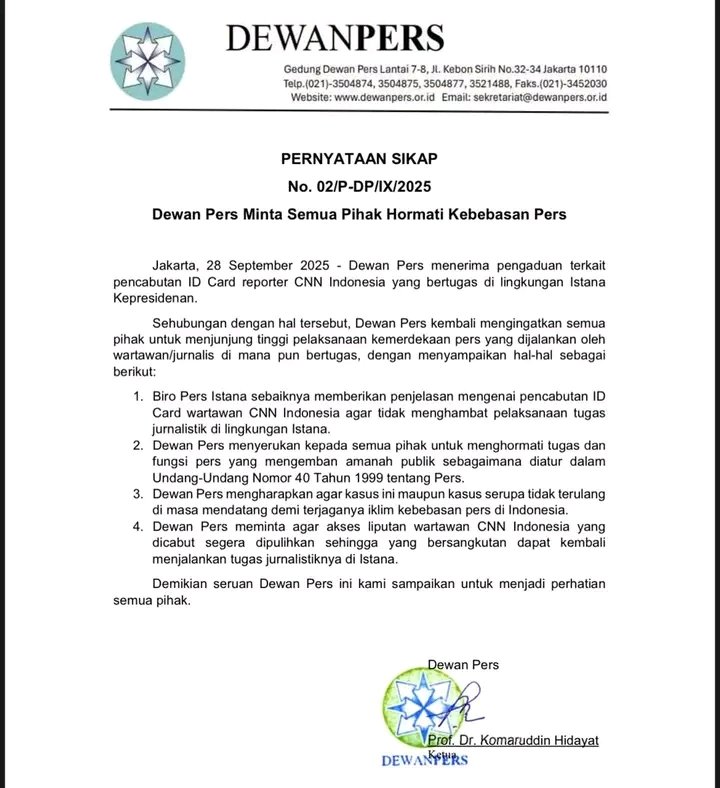 Jakarta | SUARAPURWASUKA. COM | Dewan Pers mengeluarkan pernyataan sikap terkait pengaduan pencabutan kartu identitas (ID Card) wartawan CNN Indonesia yang bertugas di lingkungan Istana Kepresidenan.28 September 2025