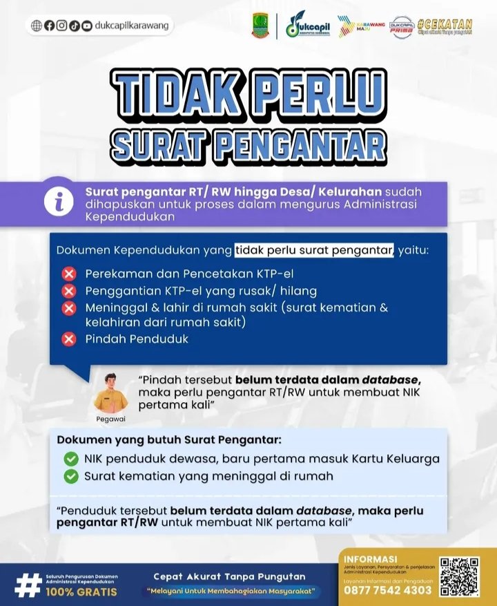 Penegasan tersebut disampaikan Dukcapil Karawang melalui akun resmi media sosialnya sebagai upaya memberikan kemudahan layanan serta menghapus prosedur yang dinilai berbelit-belit bagi masyarakat.