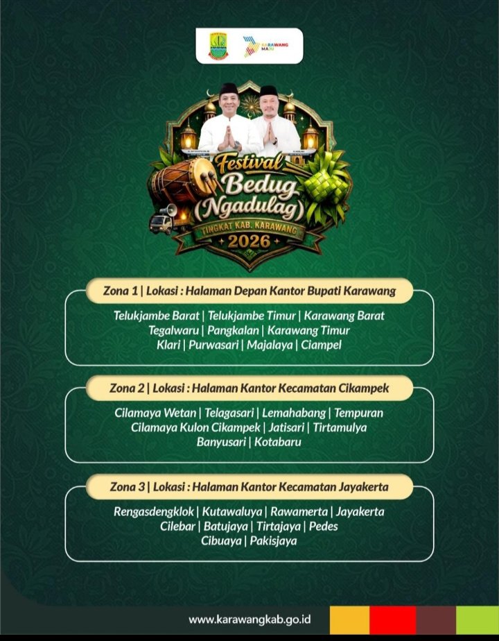 Karawang | SUARAPURWASUKA.COM– Pemerintah Kabupaten Karawang akan menggelar Festival Bedug Ngadulag Tingkat Kabupaten Karawang Tahun 2026 sebagai bagian dari rangkaian kegiatan menyemarakkan bulan suci Ramadan 1447 Hijriah. Kegiatan ini akan dilaksanakan di tiga zona berbeda yang melibatkan berbagai kecamatan di wilayah Karawang.