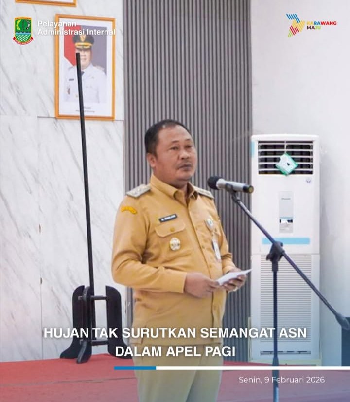 KARAWANG — Hujan yang mengguyur wilayah Karawang tidak menyurutkan semangat aparatur sipil negara (ASN) untuk mengikuti apel pagi di lingkungan Sekretariat Daerah (Setda) Kabupaten Karawang, Senin (9/2/2026). Apel dipimpin langsung oleh Wakil Bupati Karawang, H. Maslani.