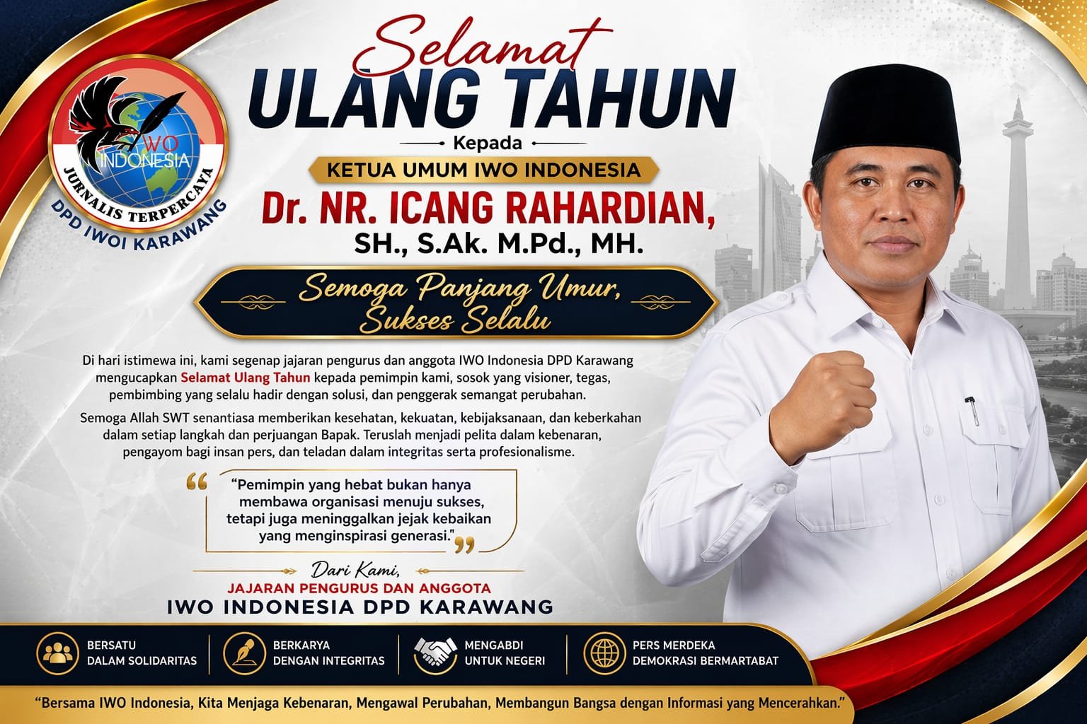 KARAWANG| SUARAPURWASUKA.COM– Suasana penuh rasa hormat dan kebanggaan menyelimuti jajaran pengurus serta anggota Ikatan Wartawan Online Indonesia (IWOI) Dewan Pimpinan Daerah (DPD) Kabupaten Karawang dalam momentum peringatan hari ulang tahun Ketua Umum IWO Indonesia, Dr. NR. Icang Rahardian, SH., S.Ak., M.Pd., MH, yang jatuh pada 20 April 2026.