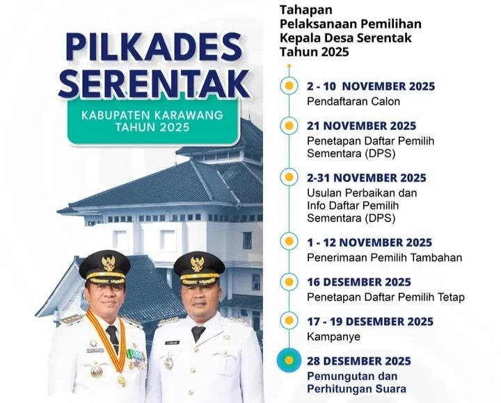 KARAWANG – Pemerintah Kabupaten Karawang akan melaksanakan Pemilihan Kepala Desa (Pilkades) Serentak pada 28 Desember 2025. Sebanyak sembilan desa di wilayah Kabupaten Karawang dijadwalkan mengikuti pesta demokrasi tingkat desa tersebut.