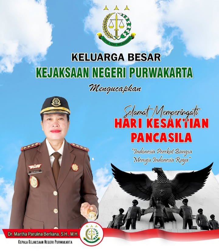 Kepala Kejaksaan Negeri Purwakarta, Dr. Martha Parulina Berliana, S.H., M.H., menyampaikan bahwa Hari Kesaktian Pancasila harus dimaknai sebagai pengingat akan pentingnya menjaga persatuan, menegakkan keadilan, dan mengabdi bagi masyarakat serta bangsa.