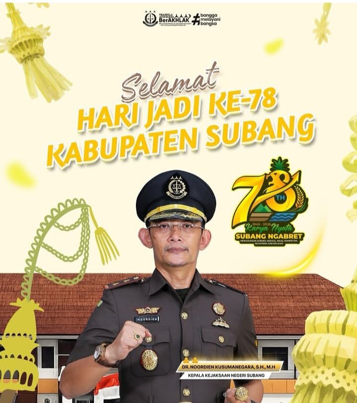 SUBANG | SUARA PURWASUKA.COM– Kepala Kejaksaan Negeri (Kejari) Subang, Dr. Noordien Kusumanegara, S.H., M.H., menyampaikan ucapan selamat atas Hari Jadi ke-78 Kabupaten Subang yang diperingati tahun ini.
