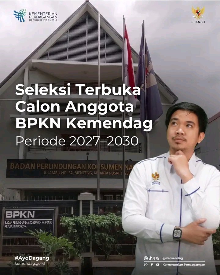 JAKARTA | SUARAPURWASUKA.COM– Kementerian Perdagangan (Kemendag) membuka kesempatan bagi masyarakat untuk bergabung sebagai anggota Badan Perlindungan Konsumen Nasional (BPKN) periode 2027–2030 melalui seleksi terbuka.