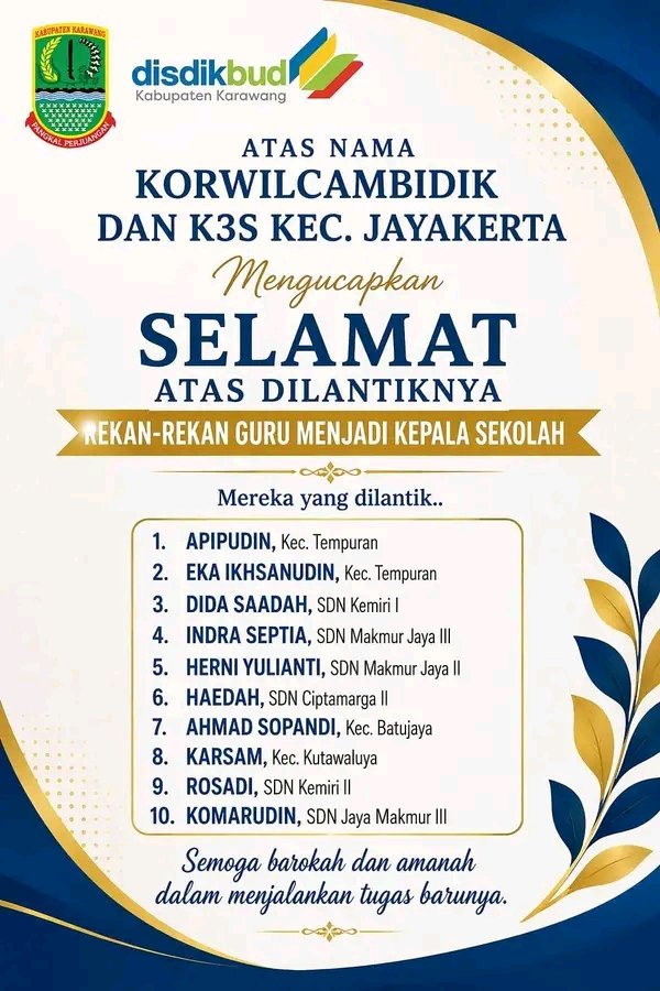 Ucapan tersebut disampaikan sebagai bentuk apresiasi dan dukungan kepada para tenaga pendidik yang kini mengemban amanah baru dalam memimpin satuan pendidikan. Dalam pernyataannya, Korwilcambidik dan K3S Jayakerta berharap para kepala sekolah yang baru dilantik dapat menjalankan tugas dengan penuh tanggung jawab serta membawa kemajuan bagi dunia pendidikan.