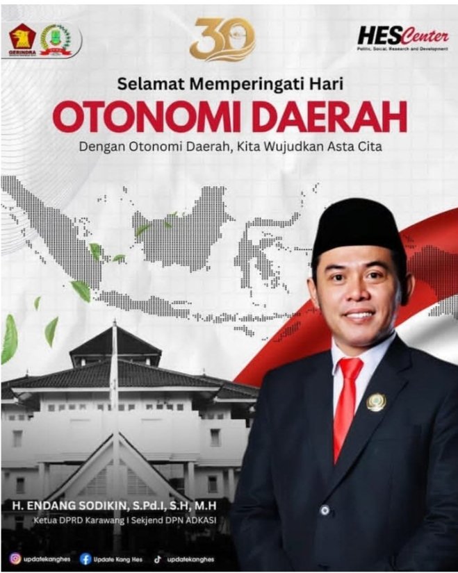 Karawang | SUARAPURWASUKA.COM- Ketua DPRD Kabupaten Karawang, H. Endang Sodikin, S.Pd.I., S.H., M.H., menyampaikan pesan khusus dalam rangka memperingati Hari Otonomi Daerah (Otda) ke-30 yang jatuh pada hari ini. Melalui unggahan resminya, sosok yang akrab disapa Kang HES tersebut menekankan pentingnya penguatan daerah demi tercapainya kemandirian bangsa.