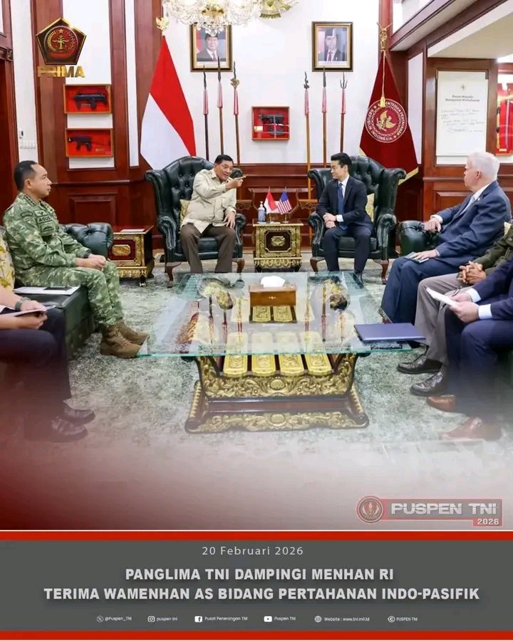 Jakarta | SUARA PURWASUKA.COM– Panglima TNI Agus Subiyanto mendampingi Menteri Pertahanan Republik Indonesia Sjafrie Sjamsoeddin menerima kunjungan kehormatan Assistant Secretary of Defense for Indo-Pacific Security Affairs Amerika Serikat, John Noh, di Kantor Kementerian Pertahanan RI, Jakarta, Rabu (18/2/2026).