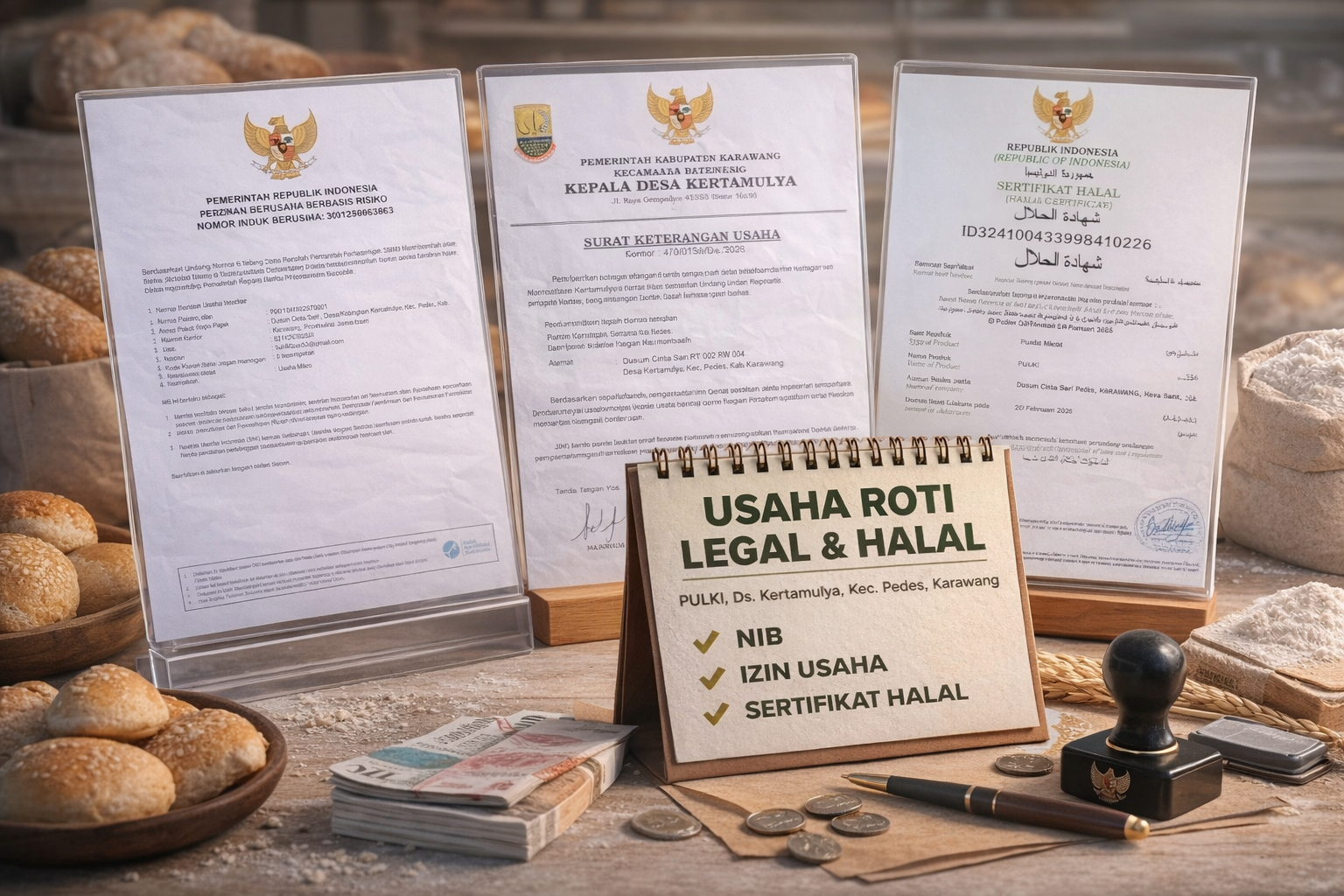 Berdasarkan dokumen yang ditunjukkan, usaha tersebut telah memiliki NIB dengan klasifikasi usaha mikro. Selain itu, terdapat Surat Keterangan Usaha yang diterbitkan Pemerintah Desa Kertamulya, Kecamatan Pedes, pada 30 Januari 2026, yang menerangkan jenis usaha berupa produksi roti rumahan.