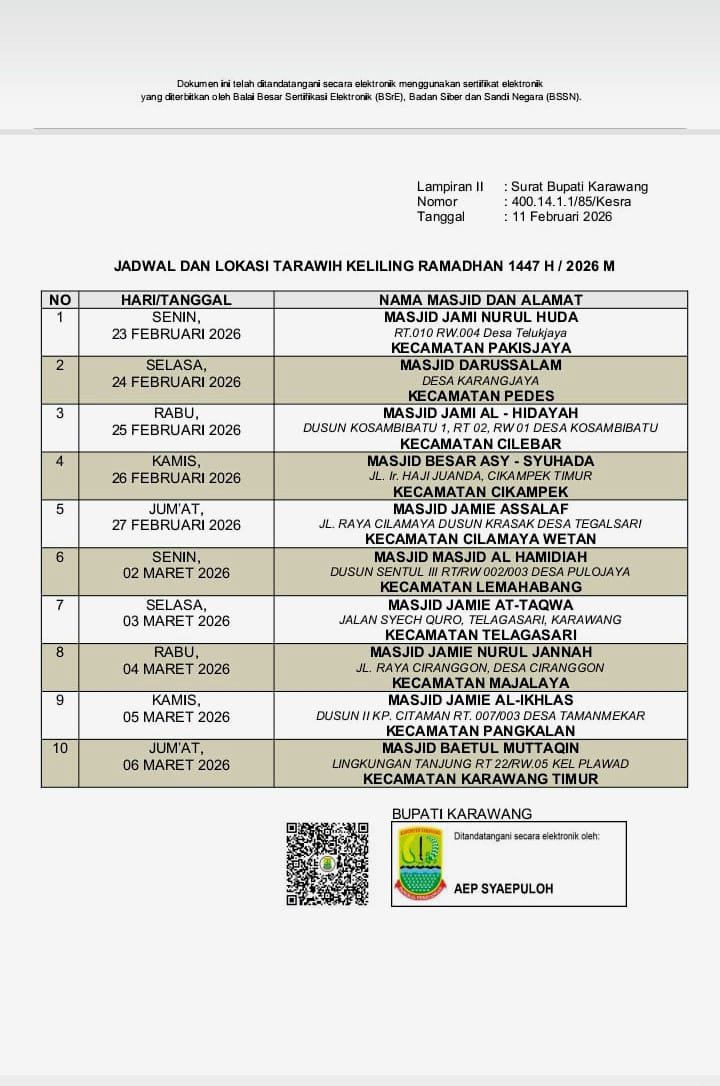 Karawang| SUARA PURWASUKA.COM– Pemerintah Kabupaten (Pemkab) Karawang merilis jadwal dan lokasi kegiatan Tarawih Keliling (Tarling) Ramadan 1447 Hijriah/2026 Masehi. Agenda tersebut tertuang dalam Lampiran II Surat Bupati Karawang Nomor 400.14.1.1/85/Kesra tertanggal 11 Februari 2026.