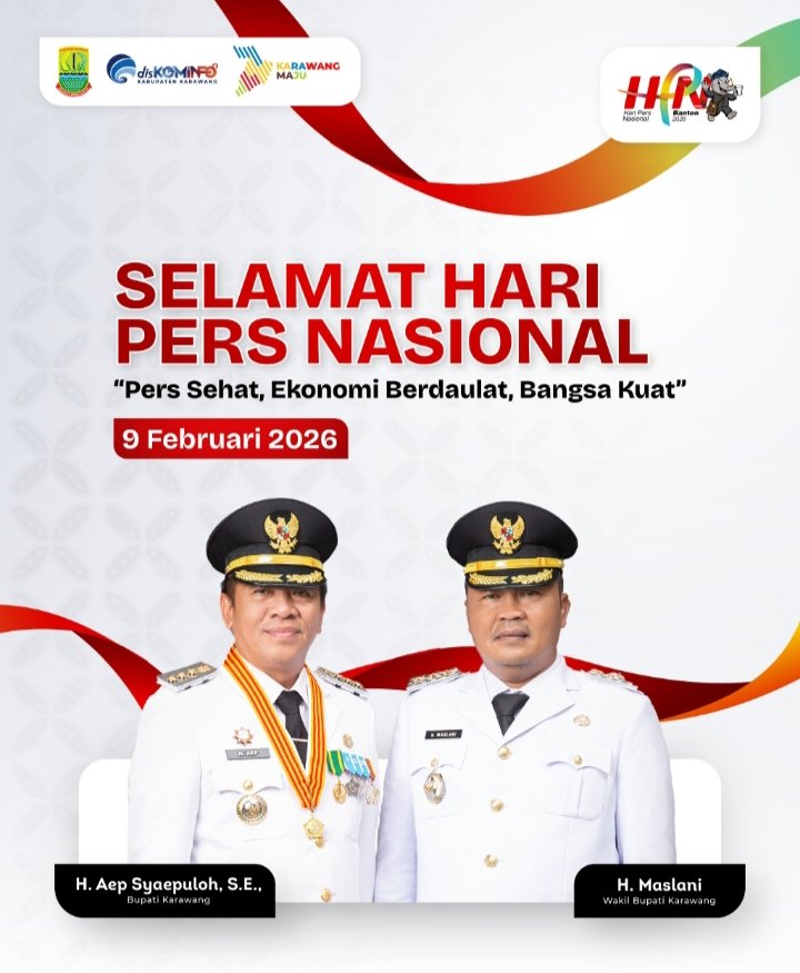 KARAWANG | SUARAPURWASUKA.COM— Pemerintah Kabupaten Karawang menyampaikan ucapan Selamat Hari Pers Nasional (HPN) 2026 yang diperingati pada 9 Februari 2026. Ucapan tersebut disampaikan melalui publikasi resmi yang menampilkan Bupati dan Wakil Bupati Karawang sebagai bentuk apresiasi terhadap insan pers.