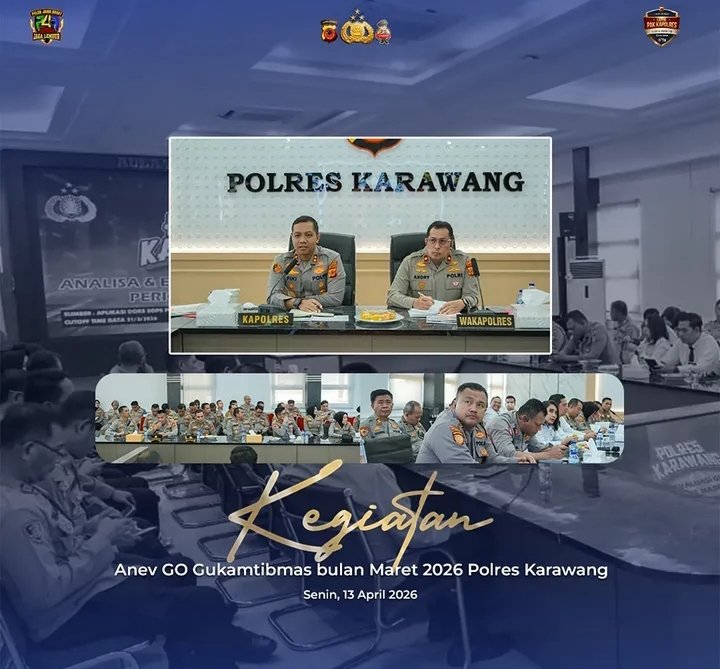 KARAWANG | SUARAPURWASUKA.COM– Kapolres Karawang Fiki Novian Ardiansyah memimpin kegiatan Analisa dan Evaluasi (Anev) Gangguan Operasional (GO) Kamtibmas untuk periode Februari–Maret 2026, yang digelar pada Senin (13/4/2026).