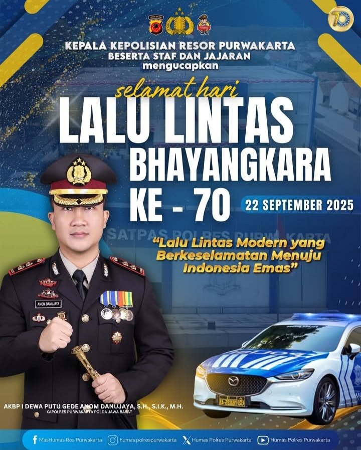 PURWAKARTA | SUARAPURWASUKA.COM | Keluarga besar Kepolisian Resor (Polres) Purwakarta bersama Kapolres AKBP I Dewa Putu Gede Anom Danujaya, S.H., S.I.K., M.H., mengucapkan selamat Hari Lalu Lintas Bhayangkara ke-70 yang diperingati pada 22 September 2025.