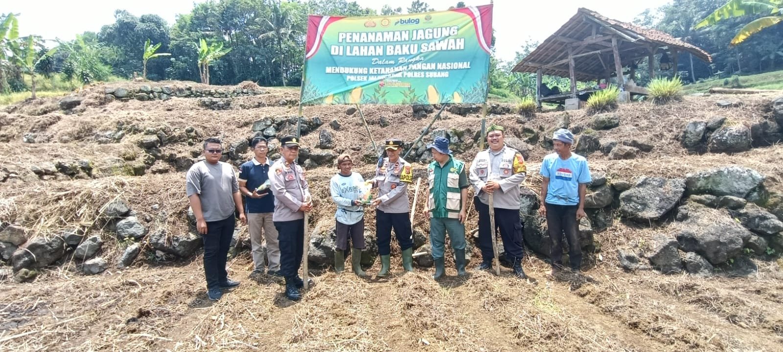 Hadir dalam kegiatan tersebut Kapolsek Jalancagak, unsur Muspika Kecamatan Jalancagak, perwakilan UPTD Pertanian Jalancagak, serta kelompok tani dilanjutkan penanaman jagung hibrida dan penyerahan bibit jagung hibrida kepada ketua kelompok tani.