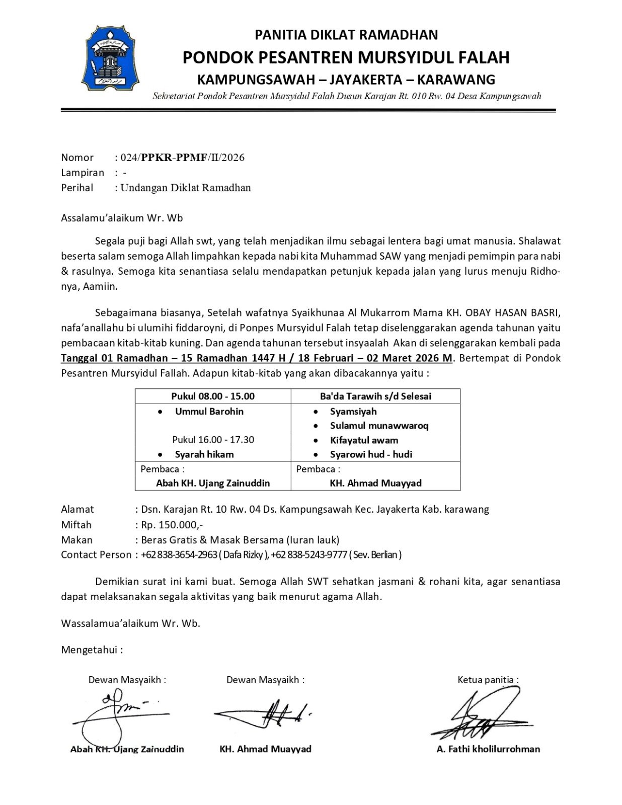 Kegiatan tersebut dijadwalkan berlangsung mulai 1 Ramadhan 1447 H atau bertepatan dengan 18 Februari hingga 2 Maret 2026 M, bertempat di lingkungan Pondok Pesantren Mursyidul Falah, Dusun Karajan, Desa Kampungsawah.