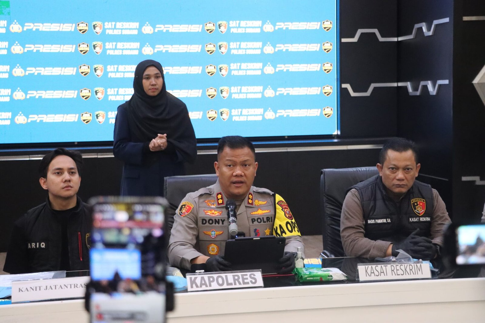 Konferensi pers dipimpin langsung oleh Kapolres Subang AKBP Dony Eko Wicaksono, S.H., S.I.K., M.H., Ph.D., didampingi Kasat Reskrim Polres Subang, Kasi Humas, Kasi Propam, Kanit Jatanras, serta personel Sat Reskrim Polres Subang.