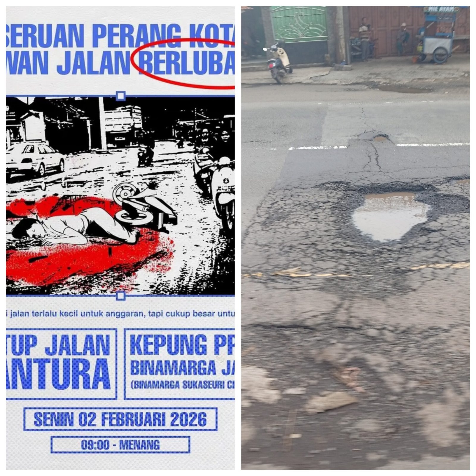 Dalam poster itu tercantum agenda aksi pada Senin, 2 Februari 2026 pukul 09.00 WIB dengan narasi kritik terhadap kondisi jalan berlubang yang dinilai membahayakan pengguna jalan. Ilustrasi pada poster menampilkan gambar kecelakaan lalu lintas, disertai tulisan yang menyinggung besarnya risiko korban akibat kerusakan jalan.